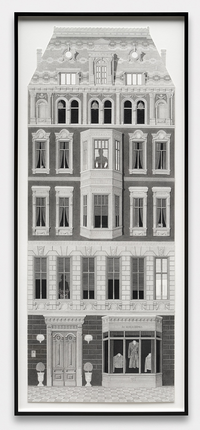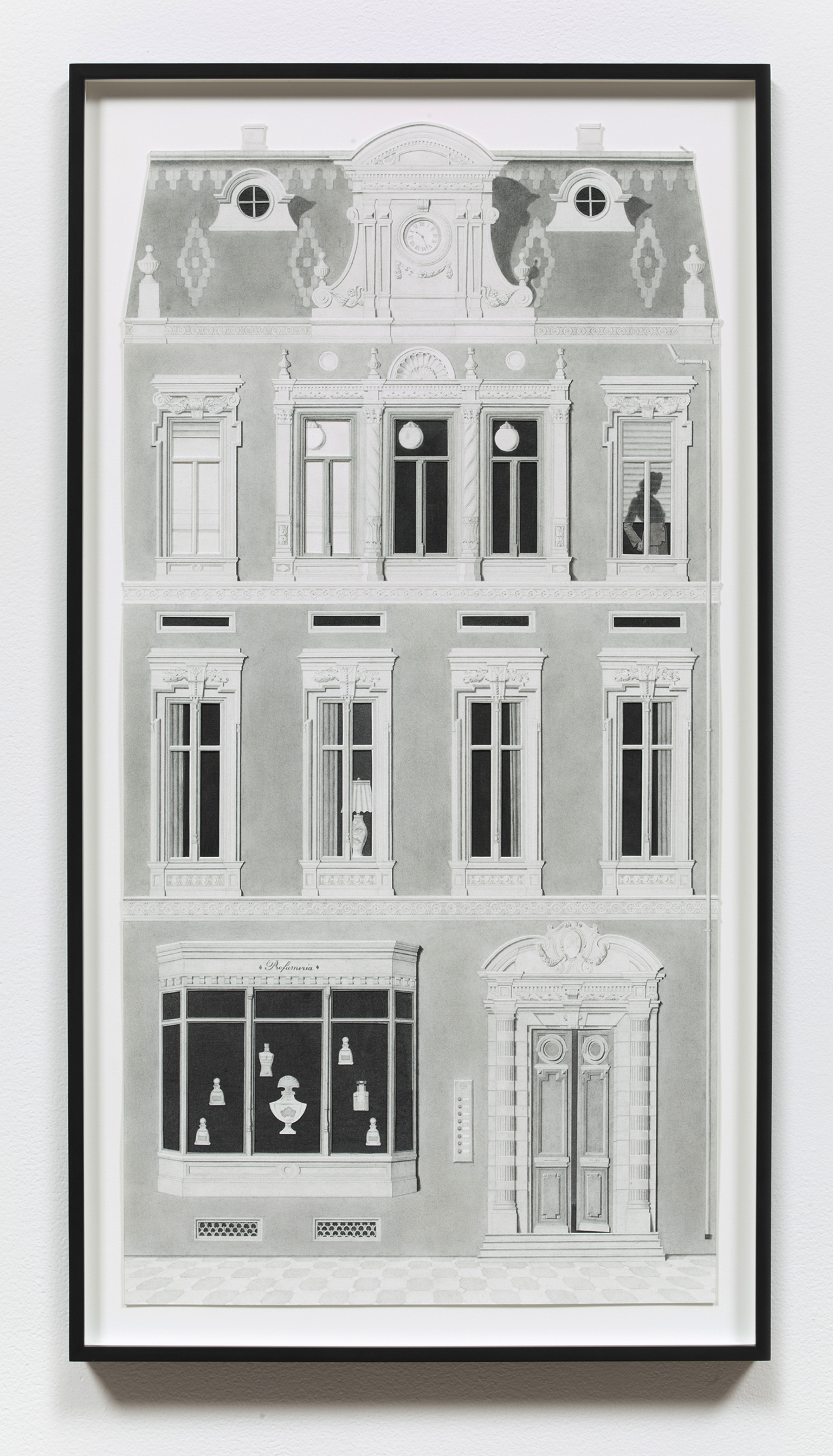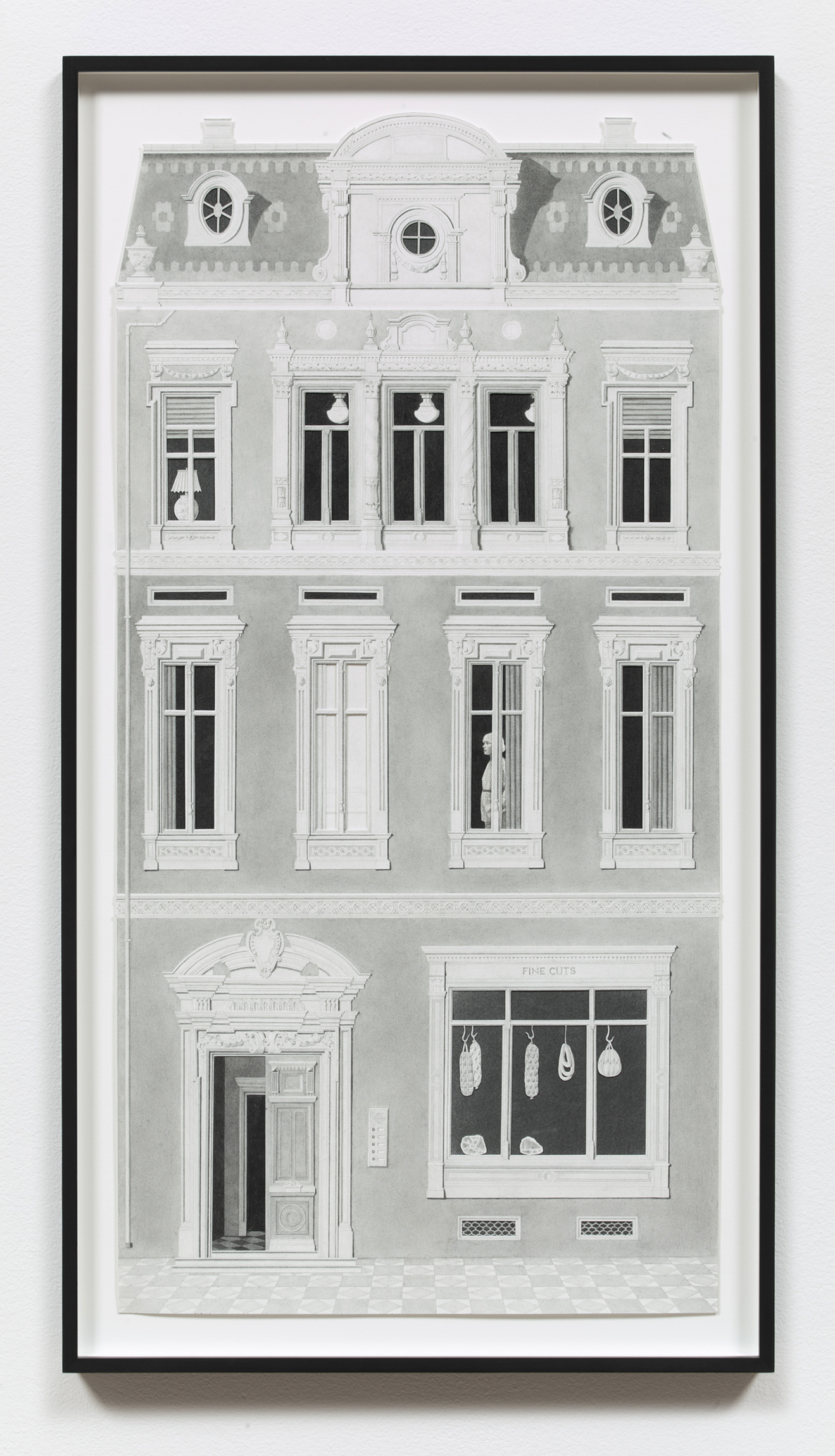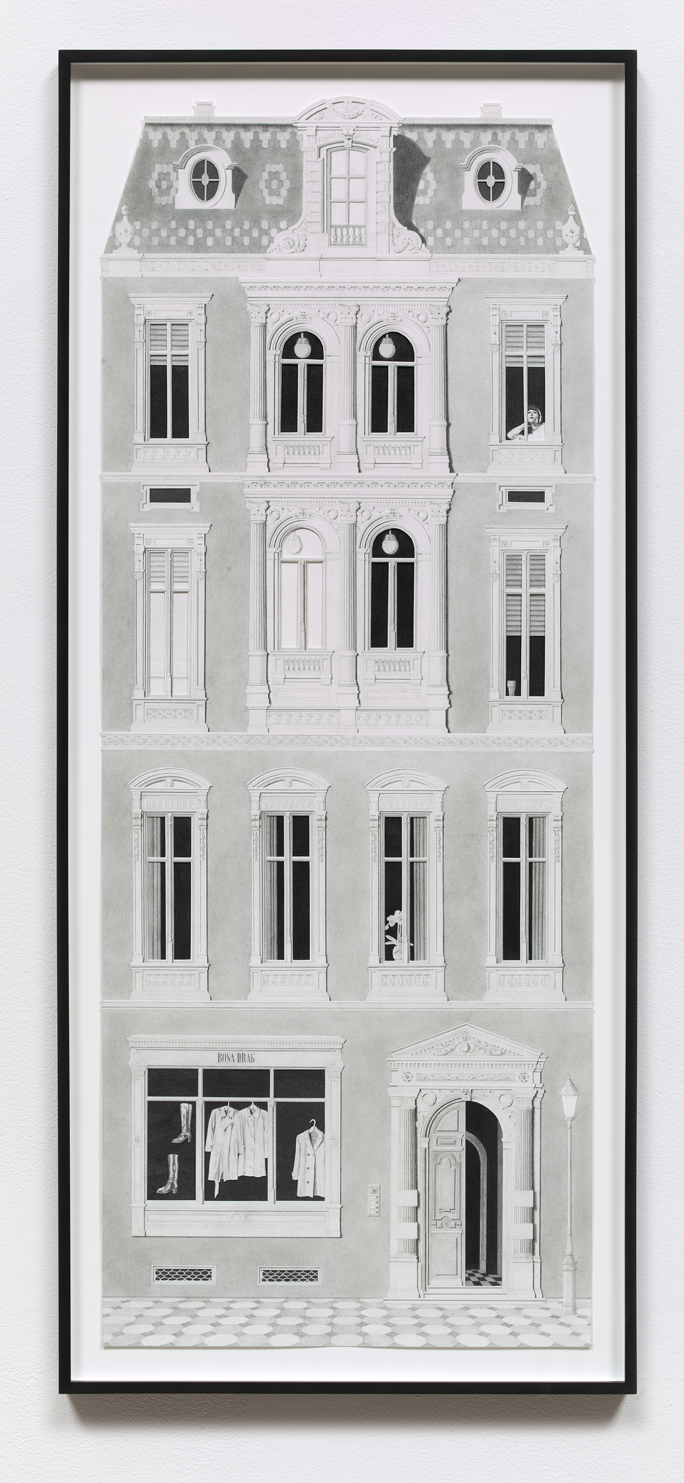 ![]() Facade (Duo Figures) graphite, ink, vinyl paint, and photo transfer on paper 27 1/8 x 39 in / 68.9 x 99.1 cm ![]() Facade (Bona Drag) graphite, ink, vinyl paint, and photo transfer on paper 38 3/8 x 15 in / 97.5 x 38.1 cm ![]() Facade (Fine Cuts) graphite, ink, vinyl paint, and photo transfer on paper 30 x 15 in / 76.2 x 38.1 cm ![]() Facade (Profumeria) graphite, ink, vinyl paint, and photo transfer on paper 30 x 15 in / 76.2 x 38.1 cm ![]() Facade (Cross-Section) graphite, ink, vinyl paint, and photo transfer on paper 27 1/8 x 39 in / 68.9 x 99.1 cm ![]() Colonnade (Figure with Umbrella) graphite, ink, vinyl paint, and photo transfer on paper 12 x 42 in / 30.5 x 106.7 cm ![]() Colonnade (Figure with Trenchcoat) graphite, ink, vinyl paint, and photo transfer on paper 12 x 41 1/2 in / 30.5 x 105.4 cm ![]() Elevations (Bed and Bath) graphite, ink, vinyl paint, and photo transfer on paper 30 x 20 in / 76.2 x 50.8 cm ![]() Room with Tiled Floor I graphite, ink, vinyl paint, and photo transfer on paper mounted to board, backcloth 9 x 7 x 7 in / 22.9 x 17.8 x 17.8 cm ![]() Room with Tiled Floor II graphite, ink, vinyl paint, and photo transfer on paper mounted to board, backcloth 8 x 5 1/2 x 5 1/2 in / 20.3 x 14 x 14 cm ![]() Tall Ext. (Consignments) graphite, ink, vinyl paint, and photo transfer on paper 38 1/4 x 15 in / 97.2 x 38.1 cm ![]() Tall Ext. (Alterations) graphite, ink, vinyl paint, and photo transfer on paper 38 1/4 x 15 in / 97.2 x 38.1 cm ![]() Horizontal Ext. (Three Storefronts) graphite, ink, and vinyl paint on paper 11 1/4 x 16 in / 28.6 x 40.6 cm ![]() Night Ext. with Stairs graphite, ink, vinyl paint, and photo transfer on paper 16 x 9 in / 40.6 x 22.9 cm |