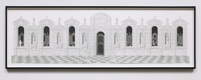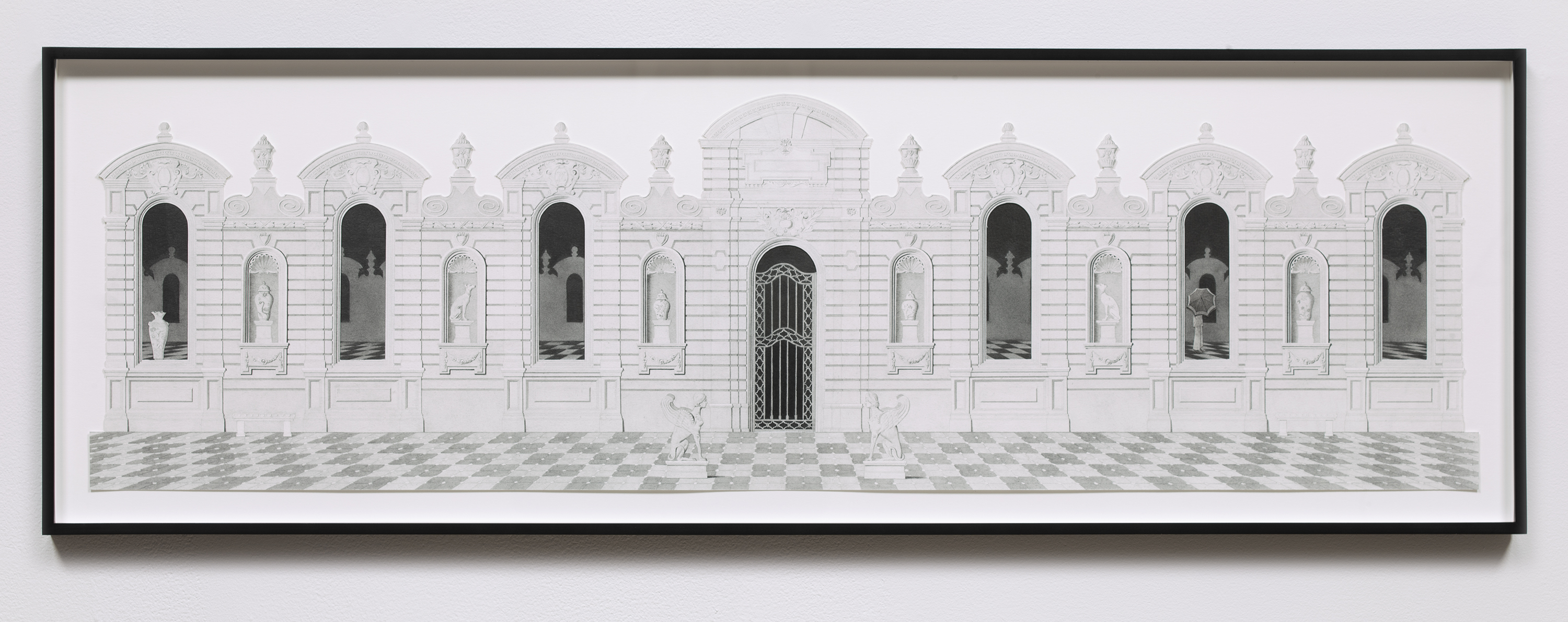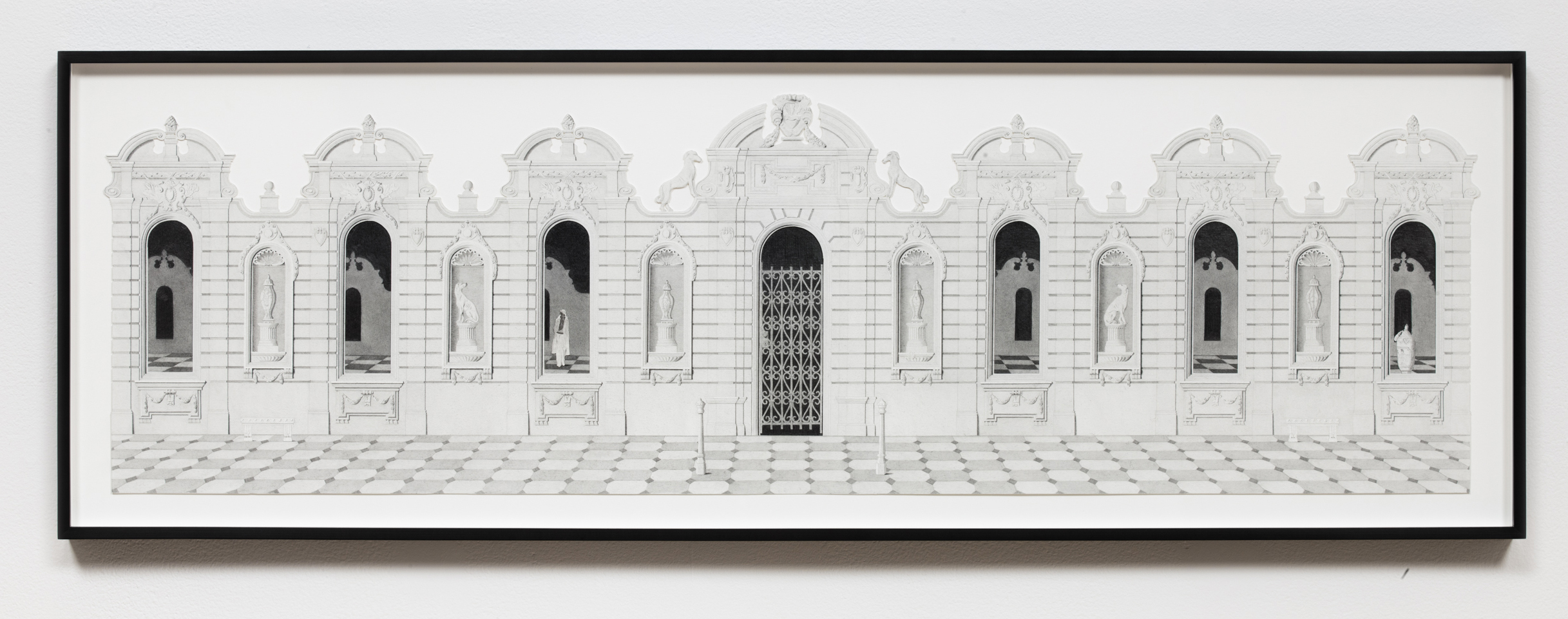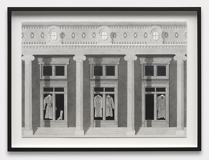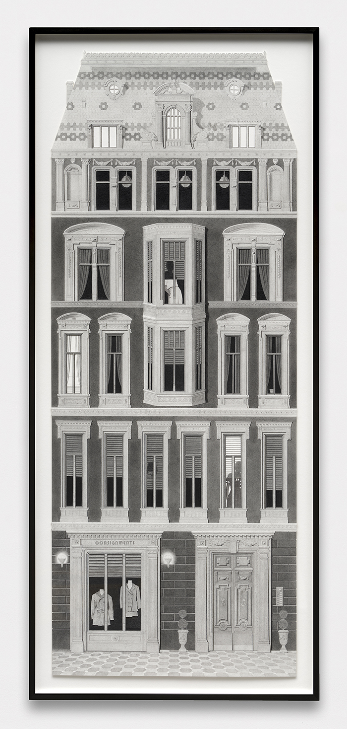 ![]() Facade (Duo Figures) graphite, ink, vinyl paint, and photo transfer on paper 27 1/8 x 39 in / 68.9 x 99.1 cm ![]() Facade (Bona Drag) graphite, ink, vinyl paint, and photo transfer on paper 38 3/8 x 15 in / 97.5 x 38.1 cm ![]() Facade (Fine Cuts) graphite, ink, vinyl paint, and photo transfer on paper 30 x 15 in / 76.2 x 38.1 cm ![]() Facade (Profumeria) graphite, ink, vinyl paint, and photo transfer on paper 30 x 15 in / 76.2 x 38.1 cm ![]() Facade (Cross-Section) graphite, ink, vinyl paint, and photo transfer on paper 27 1/8 x 39 in / 68.9 x 99.1 cm ![]() Colonnade (Figure with Umbrella) graphite, ink, vinyl paint, and photo transfer on paper 12 x 42 in / 30.5 x 106.7 cm ![]() Colonnade (Figure with Trenchcoat) graphite, ink, vinyl paint, and photo transfer on paper 12 x 41 1/2 in / 30.5 x 105.4 cm ![]() Elevations (Bed and Bath) graphite, ink, vinyl paint, and photo transfer on paper 30 x 20 in / 76.2 x 50.8 cm ![]() Room with Tiled Floor I graphite, ink, vinyl paint, and photo transfer on paper mounted to board, backcloth 9 x 7 x 7 in / 22.9 x 17.8 x 17.8 cm ![]() Room with Tiled Floor II graphite, ink, vinyl paint, and photo transfer on paper mounted to board, backcloth 8 x 5 1/2 x 5 1/2 in / 20.3 x 14 x 14 cm ![]() Tall Ext. (Consignments) graphite, ink, vinyl paint, and photo transfer on paper 38 1/4 x 15 in / 97.2 x 38.1 cm ![]() Tall Ext. (Alterations) graphite, ink, vinyl paint, and photo transfer on paper 38 1/4 x 15 in / 97.2 x 38.1 cm ![]() Horizontal Ext. (Three Storefronts) graphite, ink, and vinyl paint on paper 11 1/4 x 16 in / 28.6 x 40.6 cm ![]() Night Ext. with Stairs graphite, ink, vinyl paint, and photo transfer on paper 16 x 9 in / 40.6 x 22.9 cm |