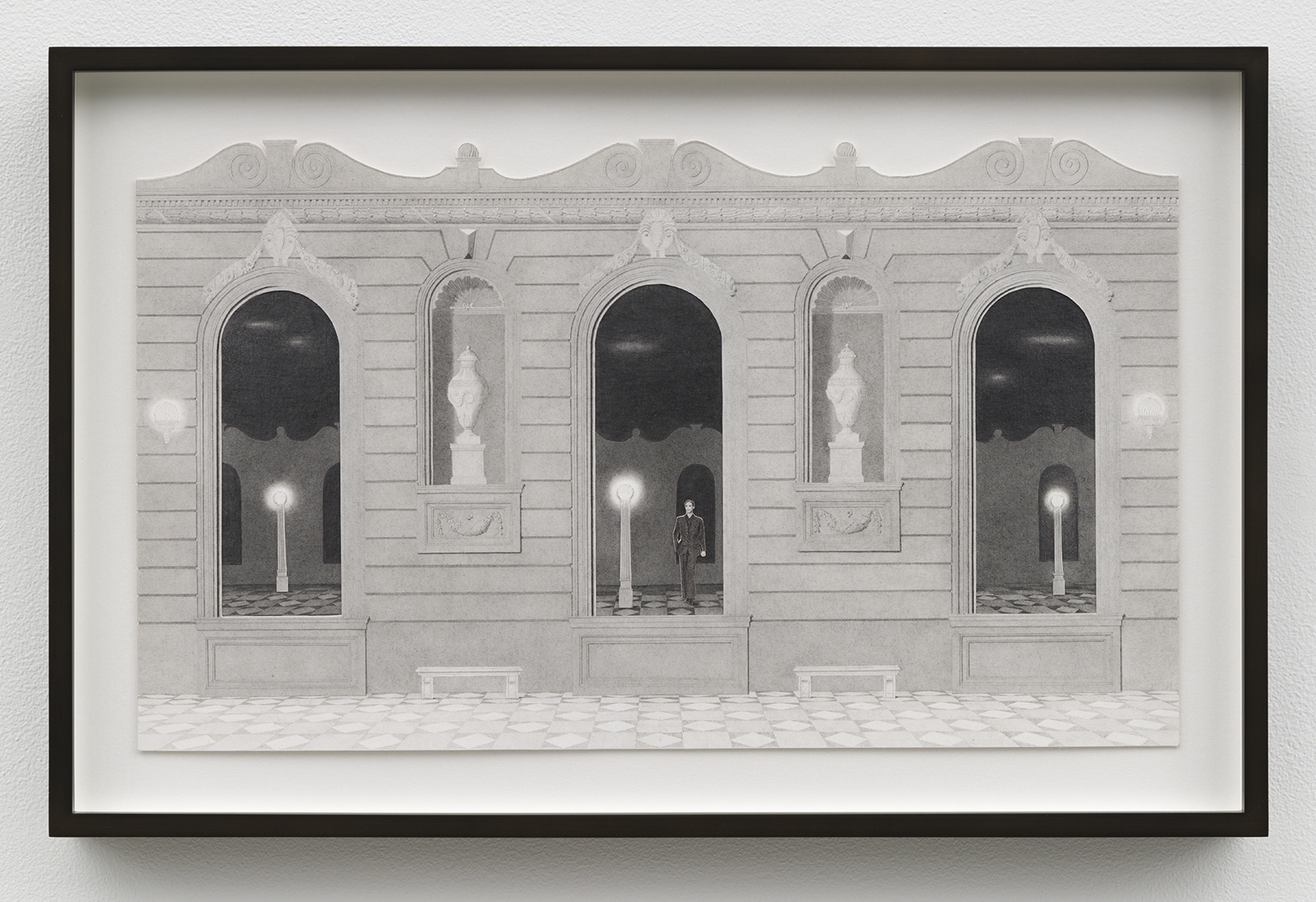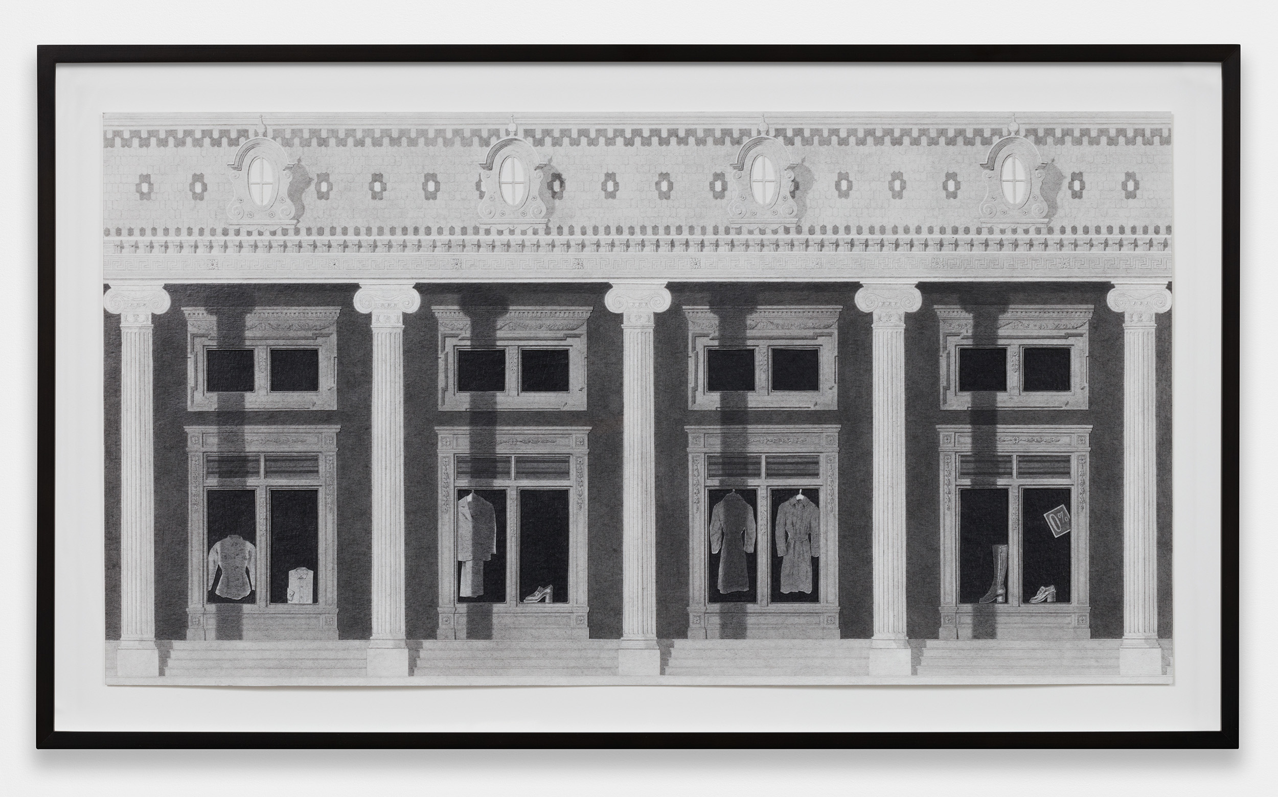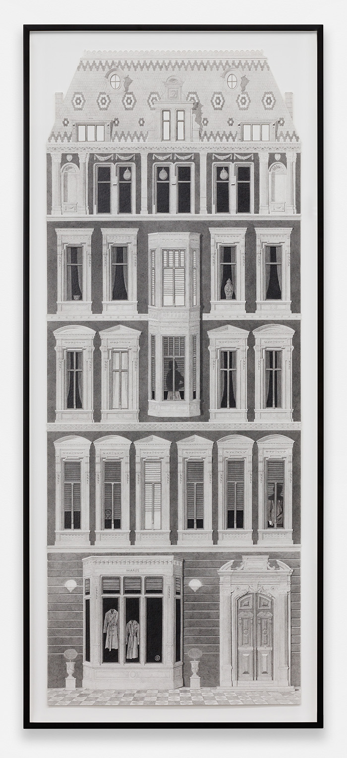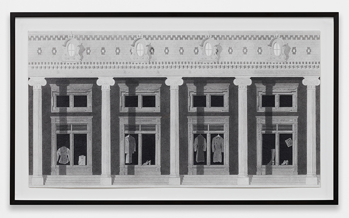 ![]() Colonnade with Lanterns graphite, ink, and photo transfer on paper 9 1/2 x 16 1/4 in / 24.1 x 41.3 cm ![]() Scene with Caryatids graphite, ink, vinyl paint, and photo transfer on paper 12 x 9 in / 30.5 x 22.9 cm ![]() Four Storefronts (Wardrobe) graphite, ink, vinyl paint, and photo transfer on paper 9 x 16 in / 22.9 x 40.6 cm ![]() Horizontal Exterior (Four Storefronts) graphite, ink, and vinyl paint on paper 12 x 22 3/4 in / 30.5 x 56.8 cm ![]() Night Exterior (Tiled Roof) graphite, ink, vinyl paint, and photo transfer on paper 19 3/4 x 9 in / 50.2 x 22.9 cm ![]() Night Exterior (Wares) graphite, ink, vinyl paint, and photo transfer on paper 38 3/4 x 15 in / 98.4 x 38.1 cm ![]() Night Exterior (Essentials) graphite, ink, vinyl paint, and photo transfer on paper 38 3/4 x 15 in / 98.4 x 38.1 cm ![]() Corner (Two Halves) graphite, ink, vinyl paint, and photo transfer on paper mounted to board, backcloth 7 3/4 x 6 x 6 in / 19.7 x 15.2 x 15.2 cm |