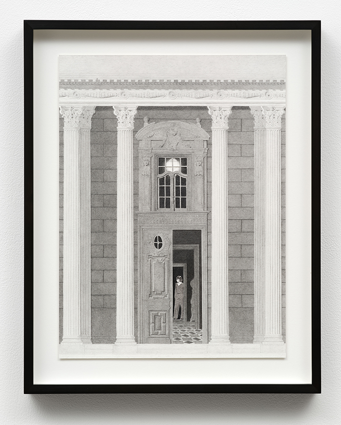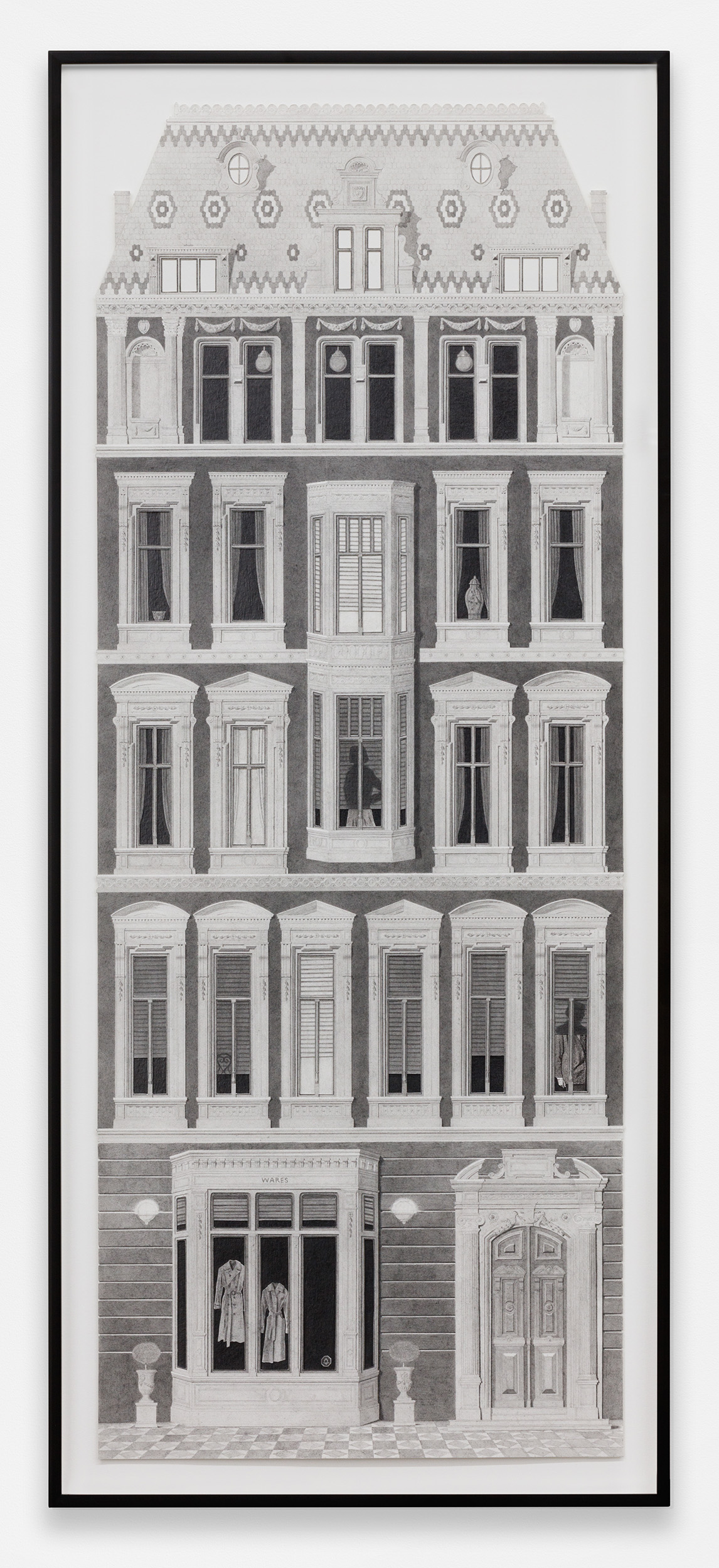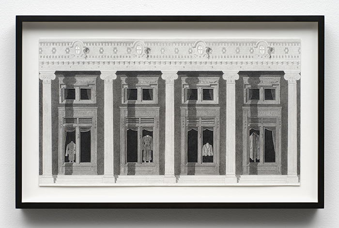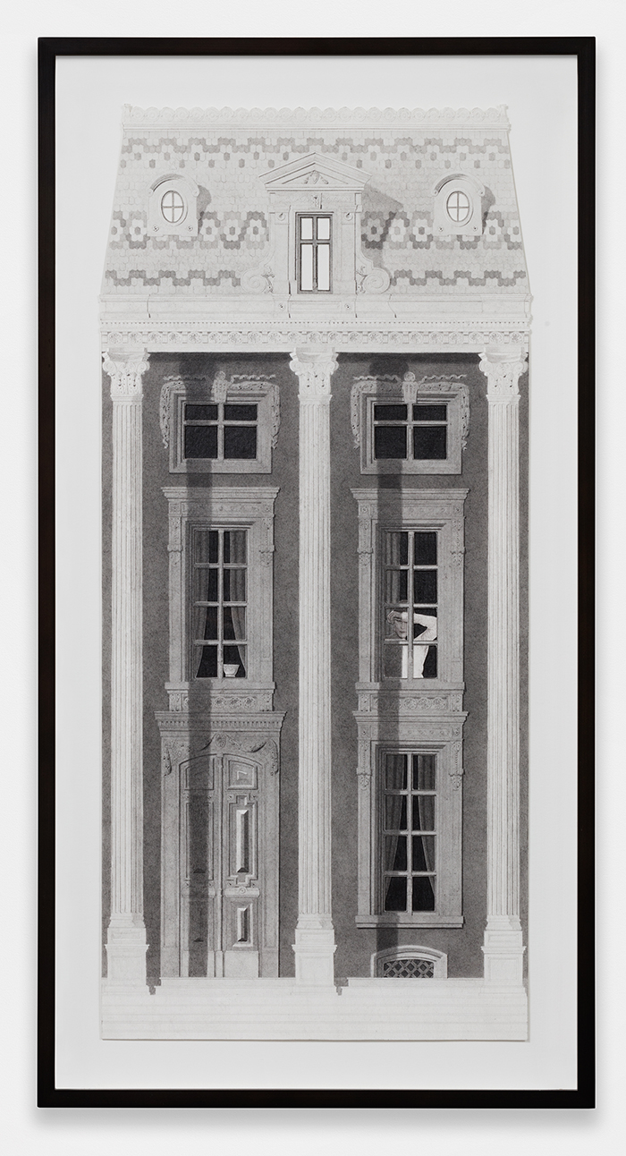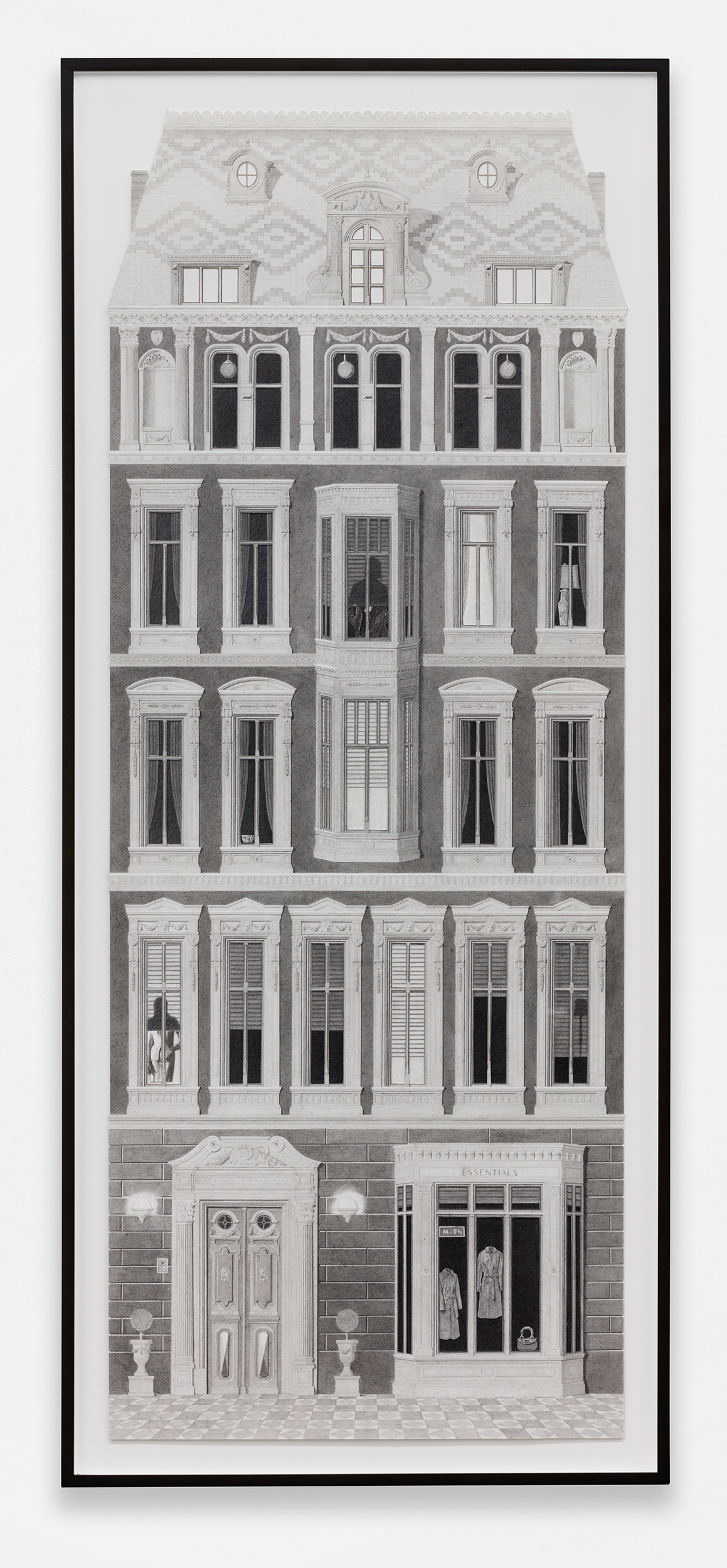 ![]() Colonnade with Lanterns graphite, ink, and photo transfer on paper 9 1/2 x 16 1/4 in / 24.1 x 41.3 cm ![]() Scene with Caryatids graphite, ink, vinyl paint, and photo transfer on paper 12 x 9 in / 30.5 x 22.9 cm ![]() Four Storefronts (Wardrobe) graphite, ink, vinyl paint, and photo transfer on paper 9 x 16 in / 22.9 x 40.6 cm ![]() Horizontal Exterior (Four Storefronts) graphite, ink, and vinyl paint on paper 12 x 22 3/4 in / 30.5 x 56.8 cm ![]() Night Exterior (Tiled Roof) graphite, ink, vinyl paint, and photo transfer on paper 19 3/4 x 9 in / 50.2 x 22.9 cm ![]() Night Exterior (Wares) graphite, ink, vinyl paint, and photo transfer on paper 38 3/4 x 15 in / 98.4 x 38.1 cm ![]() Night Exterior (Essentials) graphite, ink, vinyl paint, and photo transfer on paper 38 3/4 x 15 in / 98.4 x 38.1 cm ![]() Corner (Two Halves) graphite, ink, vinyl paint, and photo transfer on paper mounted to board, backcloth 7 3/4 x 6 x 6 in / 19.7 x 15.2 x 15.2 cm |